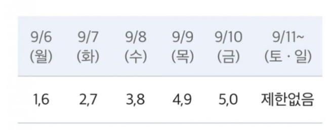출생 연도 끝자리 1,6(월) 2,7(화) 3,8(수) 4,9(목) 5,0(금) 주말인 토요일과 일요일은 모든 사람이 신청 가능해요.