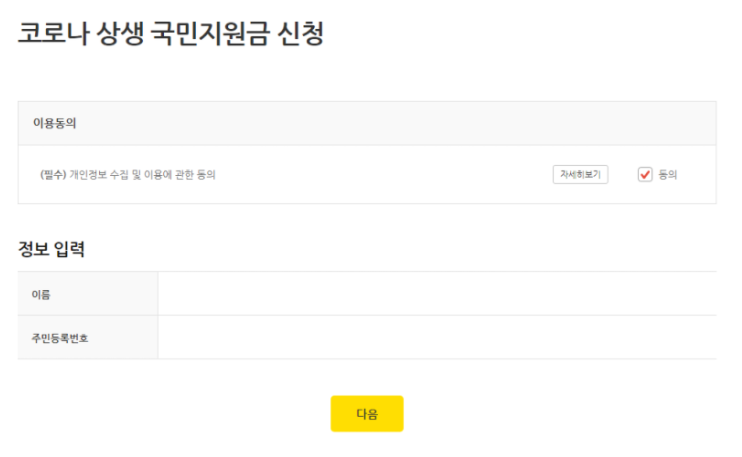 이용동의 항목에 동의에 체크해주시고 정보 입력란에 본인의 이름과 주민등록 번호를 넣어주시고 "다음" 버튼을 누르시면 대상자 조회와 코로나 상생 국민지원금 상세 설명이 나옵니다.