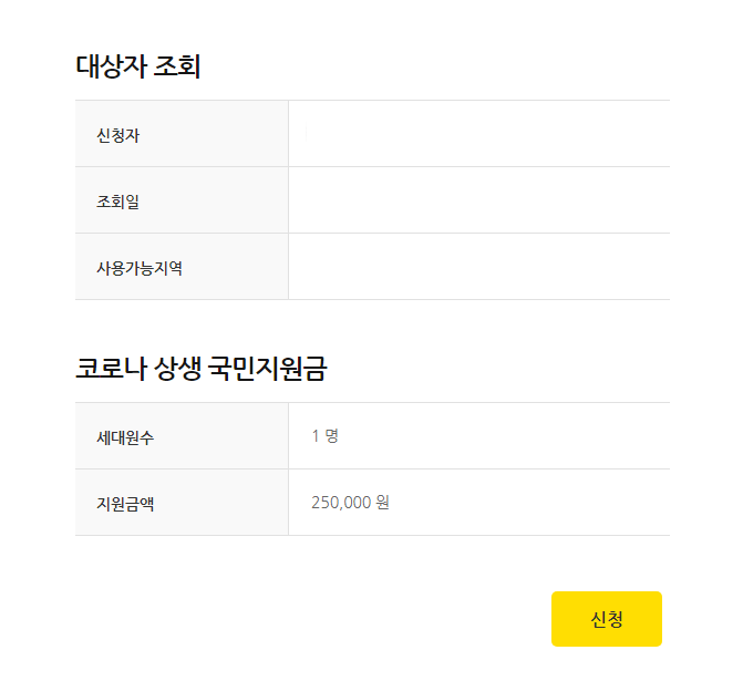 그리고 아래쪽에 신청 버튼이 나오는데 신청자 이름,조회일, 사용가능지역, 세대원수, 지원금액 확인하시고 맞다면 신청 버튼을 눌러 주시면 신청이 된 것입니다. 마지막으로 신청되었다는 페이지가 나오는데 확인 눌러주시면 됩니다.
