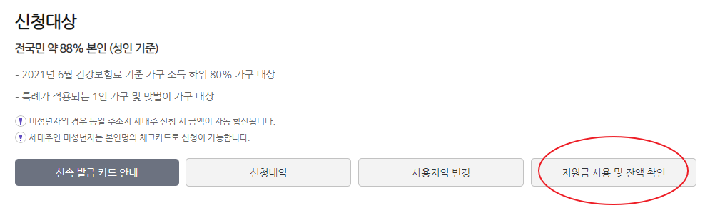 미성년자의 경우 동일 주소지 세대주 신청 시 금액이 자동으로 합산되고 세대주인 미성년자는 본인 명의 체크카드로 신청이 가능하다고 하다고 해요.
