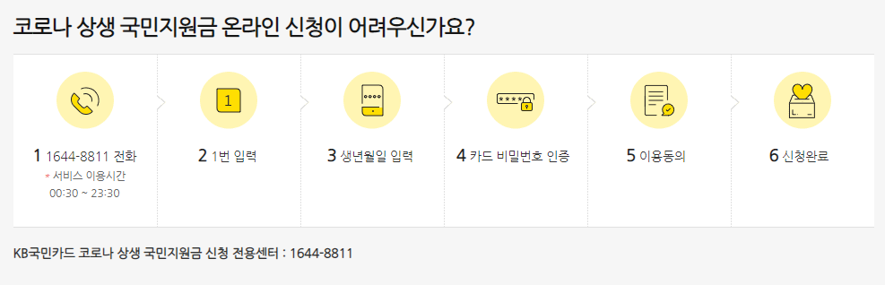 코로나 상생 국민지원금 온라인 신청이 어려우신가요? 1 1644-8811 전화 * 서비스 이용시간00:30 ~ 23:30 2 1번 입력 3 생년월일 입력 4 카드 비밀번호 인증 5 이용동의 6 신청완료 KB국민카드 코로나 상생