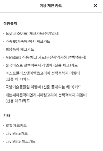 기타로는 BTS 체크카드, Liiv Mate 체크카드, 리브 메이트카드가 재난지원금 사용이 불가능합니다.