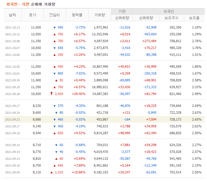 9월부터 꾸준하게 외국인과 기관이 매수하는 모양세를 그리고 있는 실정이며 개인들도 여기에 참여하는 모습을 보입니다. 최근에 외국인이 많은 양을 매도하였지만 개인이 그만큼 들어와서 막아주는 모습도 보였네요.