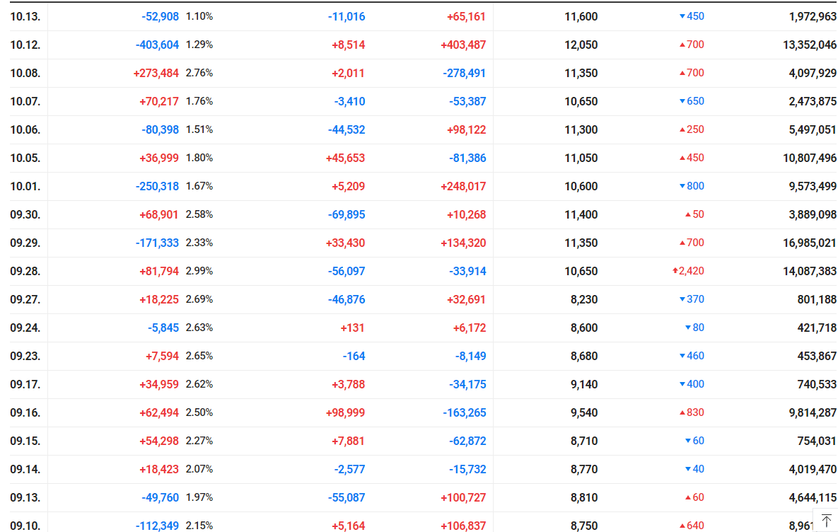 9월부터 꾸준하게 외국인과 기관이 매수하는 모양세를 그리고 있는 실정이며 개인들도 여기에 참여하는 모습을 보입니다. 최근에 외국인이 많은 양을 매도하였지만 개인이 그만큼 들어와서 막아주는 모습도 보였네요.