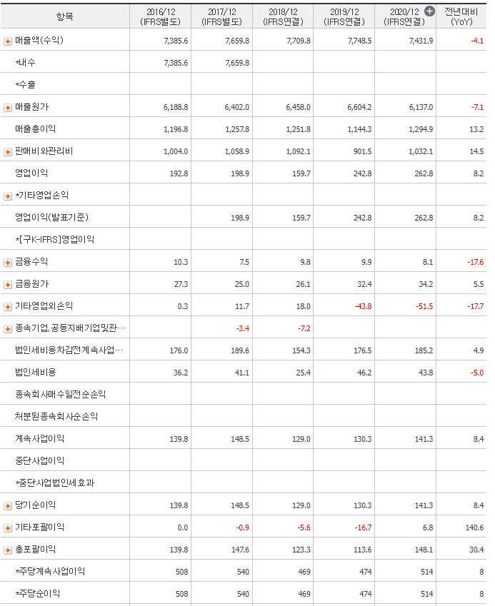 2016년도부터 보면 매출액은 비슷한 수준으로 머무르고 있으며 영업 이익은 아주 조금식 올라가고 있는 모습을 보입니다. 시가 배당률은 4% 이상으로 좋은 배당률이네요.