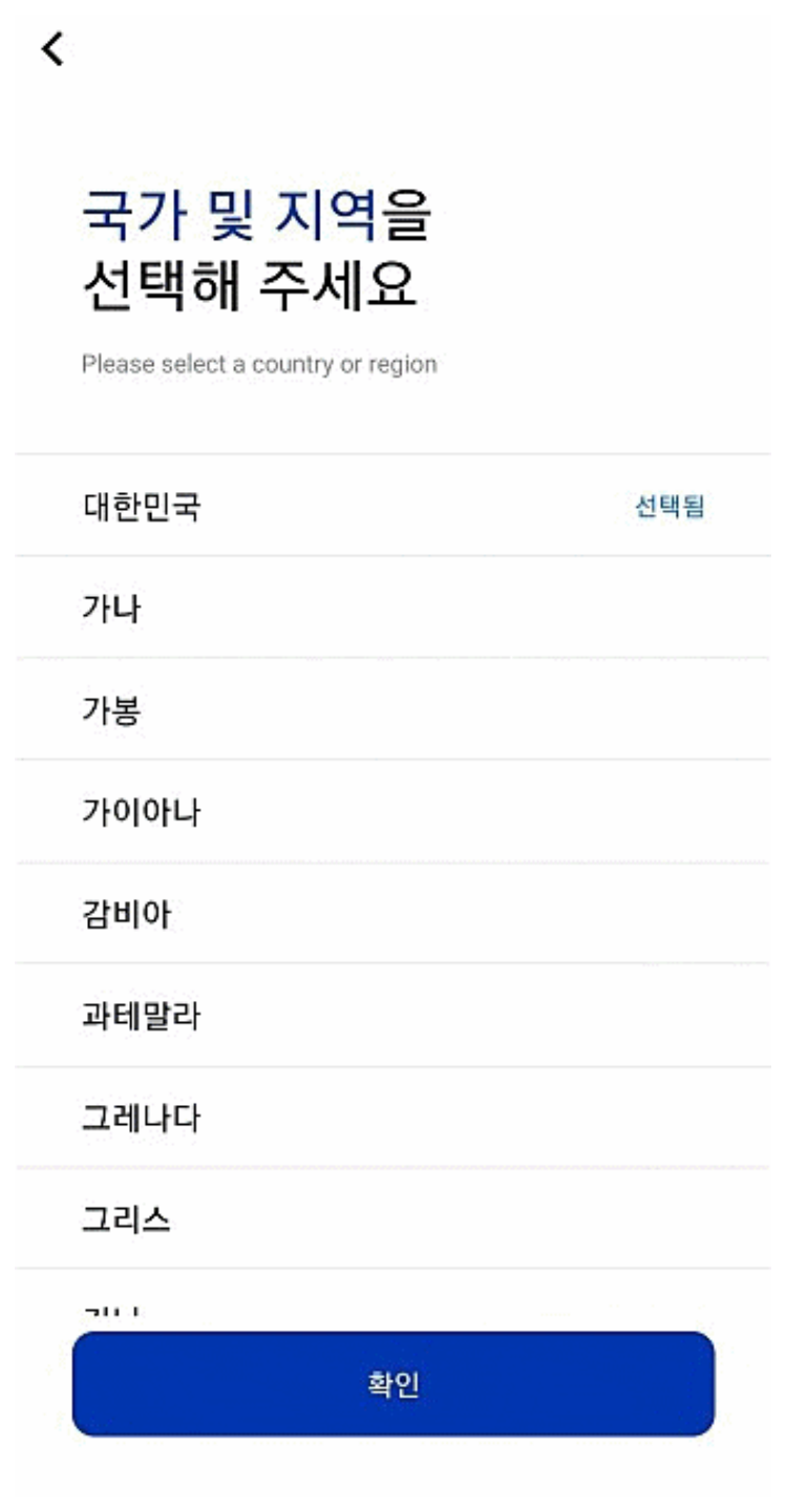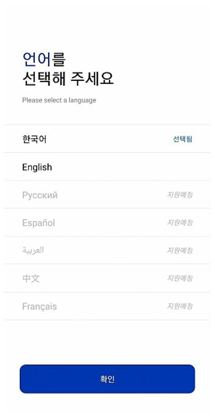 COOV(쿠브) 어플을 실행시키시면 언어 선택-한국어, 국가-대한민국을 설정하시고 확인을 눌러주세요.