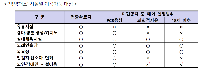 PCR 음성확인자는 유흥 시설 외에는 모두 가능하며, 의하적 사유와 18세이하의 경우는 실내 체육시설, 노래연습장, 목용장만 출입이 가능합니다.