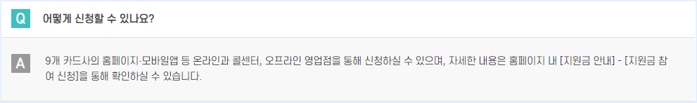 전담 카드사 홈페이지나 앱 접속▶ 본인 확인 ▶ 카드 보유 여부 확인 ▶ 이용 동의 및 참여 신청