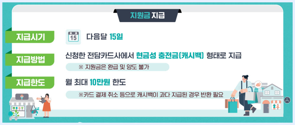 다음달 15일에 지급되며 신청한 전담카드사에 현금성 충전금 형태로 지급됩니다.