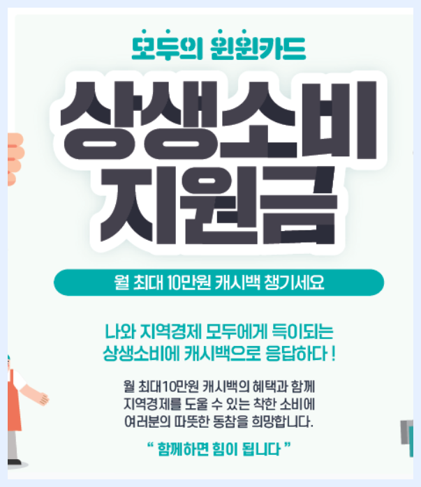 상생소비지원금(캐쉬백 제도)은 월간 카드 사용액이 2분기(4~6월) 월평균 사용액보다 3% 이상 증가했을 때 받을 수 있는 제도로써 개인당 최대 10만원 2회분을 지원받을 수 있습니다.