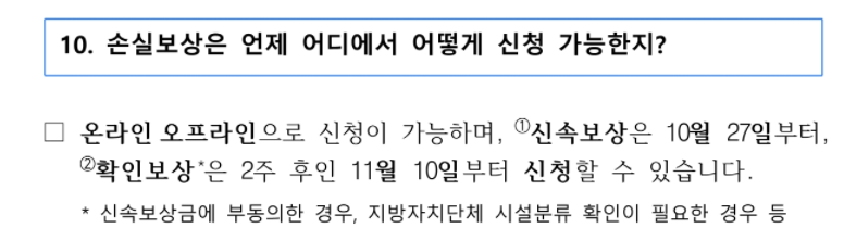 신속 보상 방법과 같은 방식으로 신청하시면 되는데 신청 날짜가 온, 오프라인 모두 11월 10일부터 신청 가능합니다.