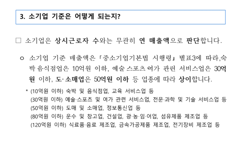 소기업 기준은 일하는 사람의 수와는 무관하며 연 매출액으로 판단을 해요.