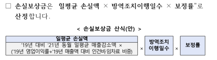소상공인 손실보상금은 "일평균 손실액 X 방역 조치 이행일 수 X 보정률"로 계산이 되어집니다.