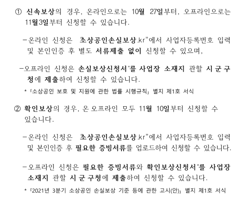 소상공인 손실보상금 신청 방법은 온라인 신청과 오프라인 신청 두 가지로 나뉘고 신속 보상과 확인 보상으로 신청할 수 있습니다. 신속 보상은 10월 27일 부터 신청가능하고 확인보상은 11월 10일부터 신청 가능합니다.