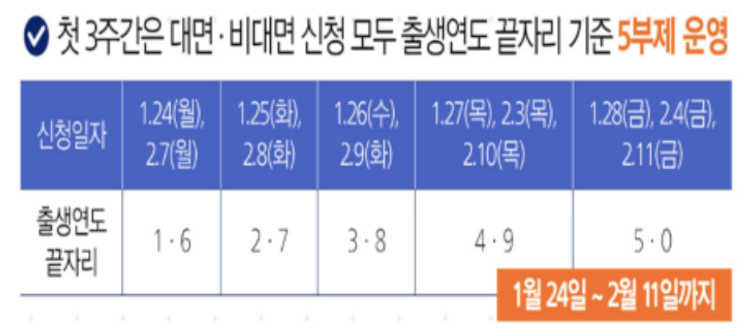 첫 3주간은 대면, 비대면 신청 모두 출생연도 끝자리 기준으로 5부제로 운영합니다.
