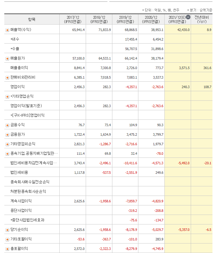 아시아나항공은 다들 잘 아시다시피 올해 1사 분기까지는 실적이 좋지 않았습니다. 코로나 터지기 전에도 점차적으로 영업 이익이 감소하는 추세였는데 2020년 코로나로 직격탄을 맞고 매출이 전년대비 절반에도 미치지 못했습니다.