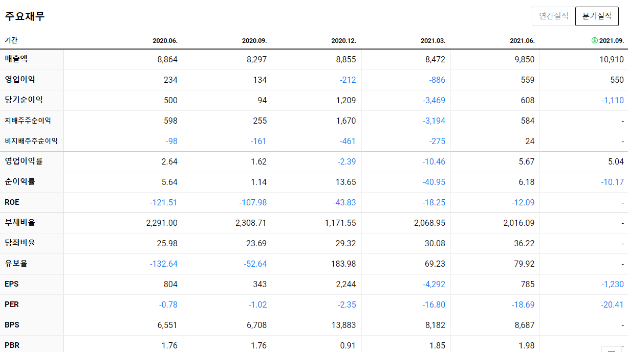 아시아나항공은 다들 잘 아시다시피 올해 1사 분기까지는 실적이 좋지 않았습니다. 코로나 터지기 전에도 점차적으로 영업 이익이 감소하는 추세였는데 2020년 코로나로 직격탄을 맞고 매출이 전년대비 절반에도 미치지 못했습니다.
