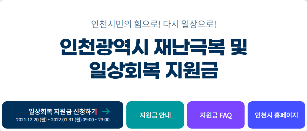 12월 20일 월요일 오전 9시부터 인천시 일상회복지원금 신청이 시작됩니다. 그동안 인천은 지원금을 잘 안 나오던 곳이라서 다른 지역과는 차별을 뒀었는데 이번에는 일찍이 사전공고도 하면서 인천시민들에게 지원금을 주려고 하는 모양새입니다. 인천시 일상회복지원금 대상, 신청방법 그 외 정보에 대해서 알려드리겠습니다.