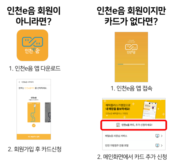 온라인 신청은 인천E음 앱 및 시, 군, 구 홈페이지를 통해 접수할 수 있으며 현장 신청은 신분증 지참하여 동, 행정복지센터에 신청서를 작성하여 신청 가능합니다.