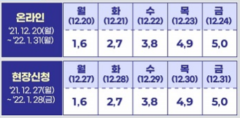 -현장 신청: 2021년 12월 27일 (월)~ 2022년 1월 28일 (금) 09~18시(토, 일요일, 공휴일 제외)