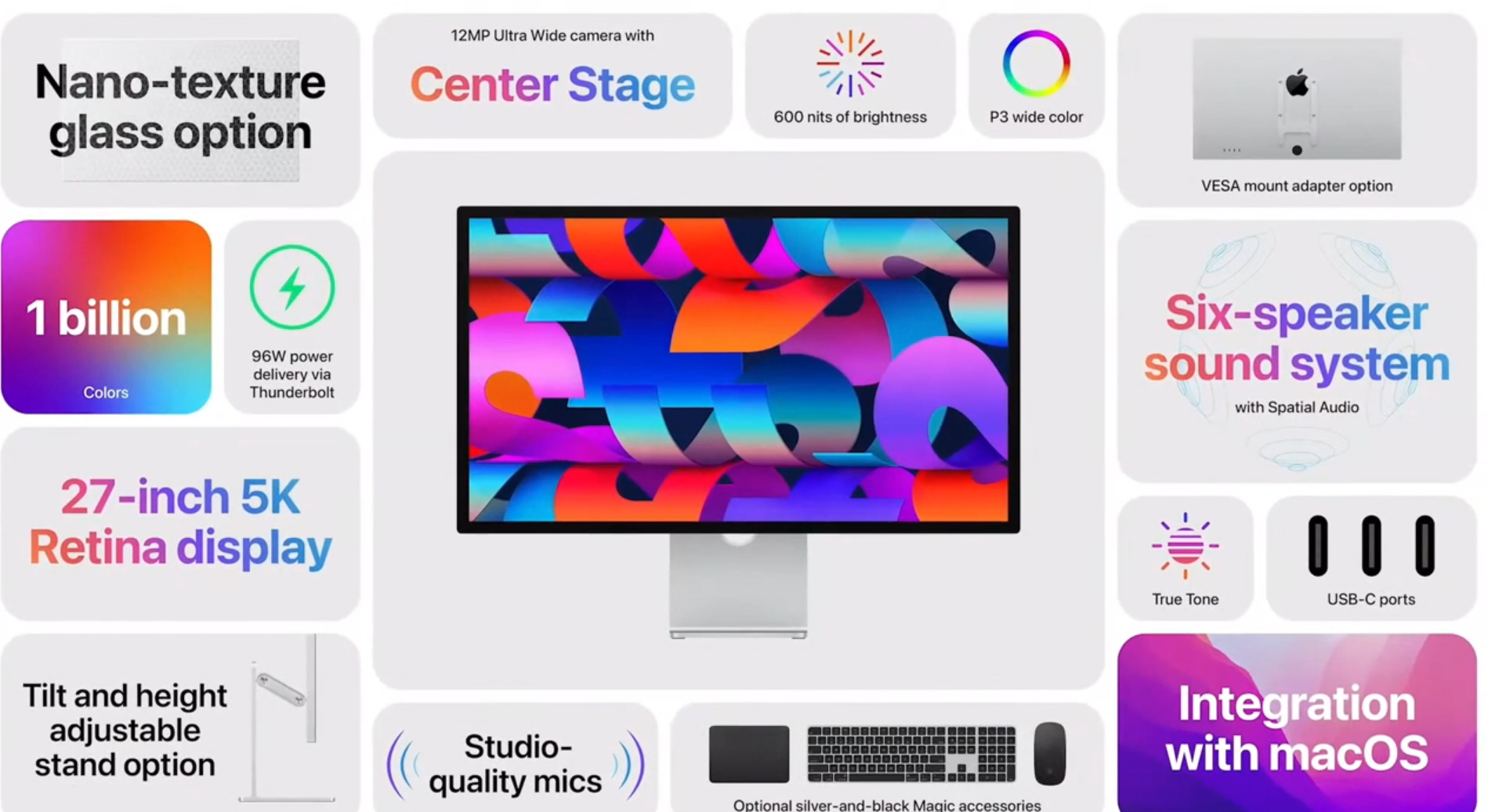 디스플레이는 기존 Mac Pro와 함께 발표되었던 Pro Display XDR 아래 등급 모델로 27인치 5k 모니터입니다. 공간 음향을 지원하는 헥사 스피커, 센터 스테이지 웹캠, A13 프로세서를 탑재하여 멀티미디어 기능을 강화했습니다.