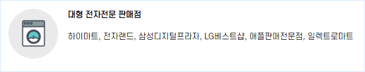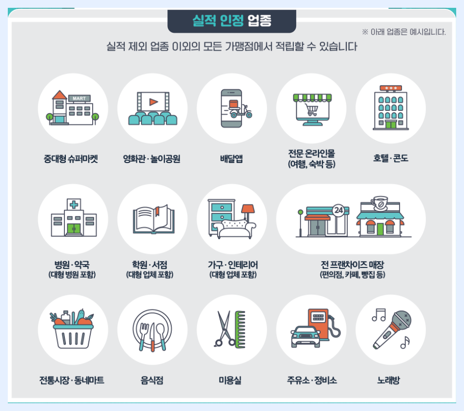기업형 슈퍼마켓이나 배달 어플(요기요, 배달의 민족 등), 식자재 이커머스(마켓 컬리 등), 스타벅스 등은 캐시백 대상에 포함됩니다. 쿠팡은 대형 온라인몰에 속해요.