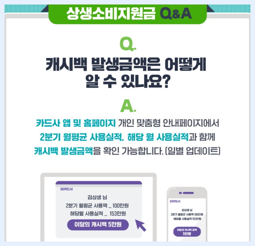 상생소비지원금(캐쉬백 제도)은 월간 카드 사용액이 2분기(4~6월) 월평균 사용액보다 3% 이상 증가했을 때 받을 수 있는 제도로써 개인당 최대 10만원 2회분을 지원받을 수 있습니다.