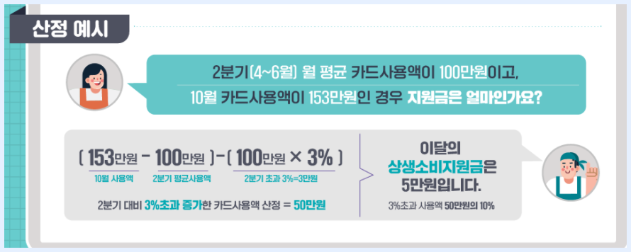예를 들면 4~6월 평균 카드 사용액이 100만 원이면 10월 카드 사용액이 153만 인 경우는 이번 달 상생 소비 지원금은 5만 원이 됩니다.