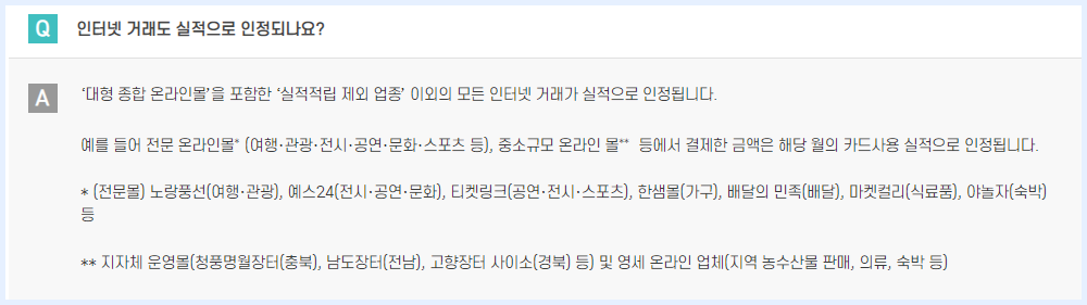 연회비, 세금, 보험료 등 비소비성 지출도 대상에 포함되지 않으나 여행·관광·전시·공연·문화·스포츠 등 전문 온라인몰에서 사용액은 인정됩니다.