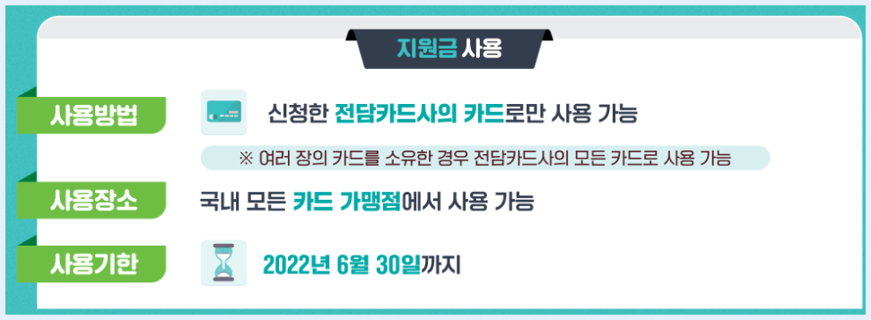 신청인이 지정한 전담카드사의 카드로만 사용 가능하며 전담 카드사의 카드가 여러 장 있을 시 모든 카드로 사용 가능합니다.