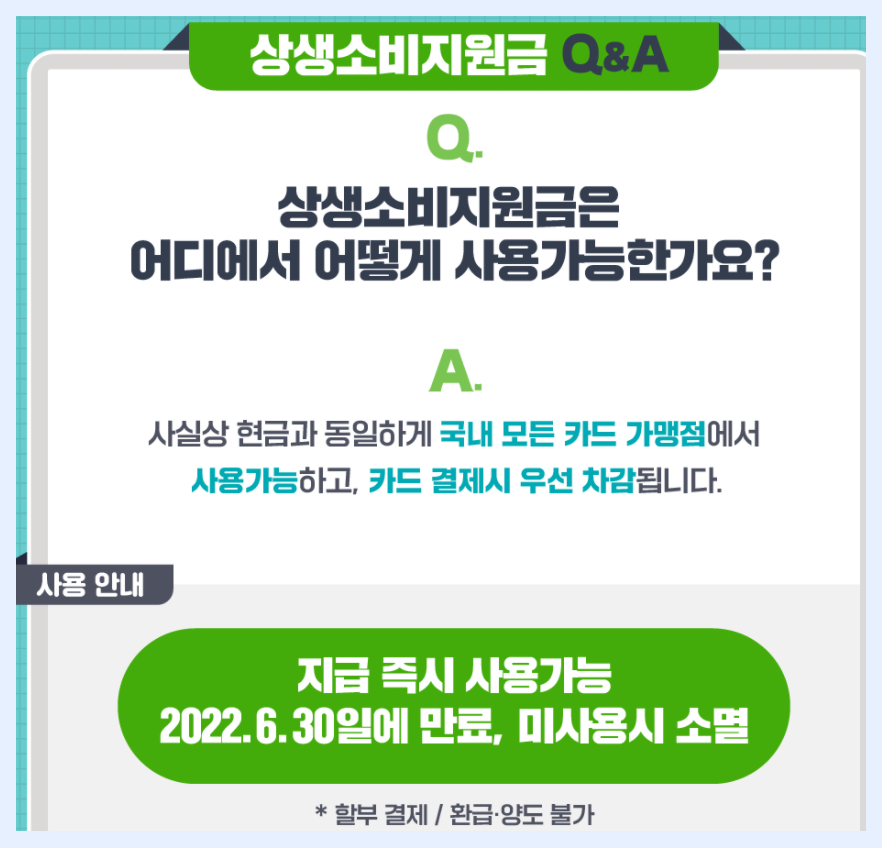 ex) 국민지원금 10만 원, 상생지원금 10만 원 있을 때 카드 10만 원 사용하면 국민지원금이 먼저 사용됩니다(국민지원금 사용기한은 올해이기 때문).