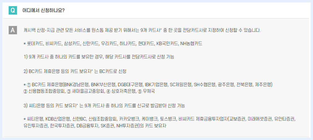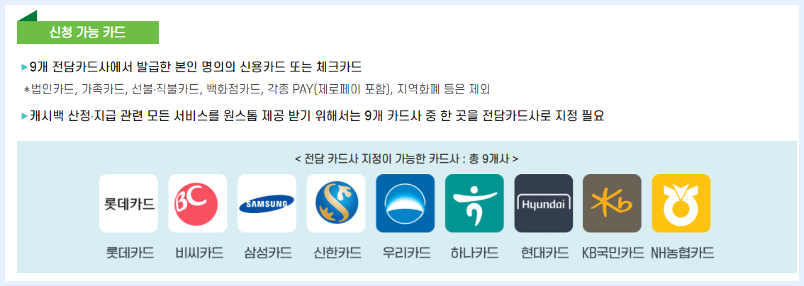 ※ 씨티은행, KDB산업은행, 신한BC, 산림조합중앙회, 카카오뱅크, 케이뱅크, 토스뱅크, 비씨카드 제휴금융투자업자(교보증권, 미래에셋증권, 유안타증권, 유진투자증권, 한국투자증권, DB금융투자, SK증권, NH투자증권)의 카드 보유자는 9개 카드사 중 하나의 카드를 신규 발급받아서 신청이 가능합니다.