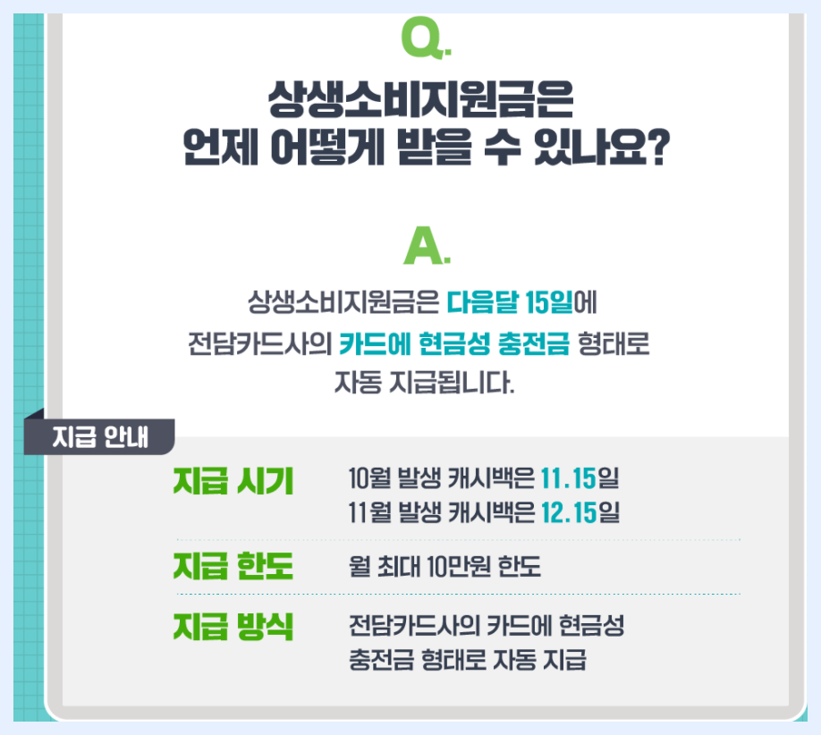 다음달 15일에 지급되며 신청한 전담카드사에 현금성 충전금 형태로 지급됩니다.