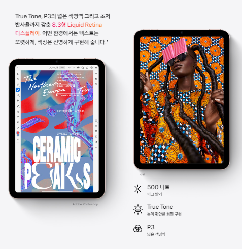 아이패드 미니 6은 500 니트의 밝기를 달성할 수 있는 8.3형 Liquid Retina 디스플레이를 탑재하여서 다양한 색상 지원, TrueTone 및 반사 방지 코팅을 제공합니다.