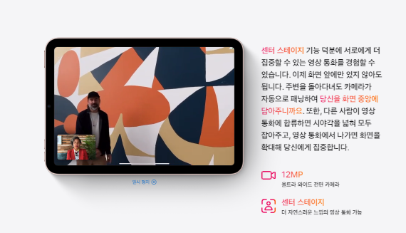 그리고 프로에서 처음 선보인 센터 전면 카메라 형식이 미니 6에 그래도 적용되어서 더 넓은 화각을 보여주고 화상통화 중에는 카메라가 자동으로 따라오는 페이스 트랙킹 기술이 도입되었습니다.